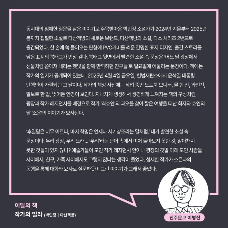 『작가의 빌라』는 12.3 내란 사태로 또 한 번의 광장을 거쳐온 우리 모두에게 광장 이면에 감춰진 모순을 어떻게 대면할 것인가라는, 시의적절하면서도 좀처럼 해소되지 않는 과제를 던지는 동시에 새로운 연대와 치유의 가능성을 조심스럽게 전한다. 논픽션 작가 ‘나’는 ‘광장 이후 20주년’ 행사에서 한때 ‘육아일기’로 인기를 끌었으나 몰락한 작가 최효연의 딸 ‘소은’을 만난다. 소설은 최효연이 저지른 과오의 진상을 알아내기 위해 두 사람이 함께 그가 마지막으로 머물렀던 작가 레지던시 ‘예술가의 뜰’로 향하는 이틀간의 여정을 담고 있다.